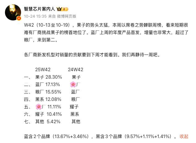 2025年第42周(10月13日-19日),中国智能手机市场迎来节后首场真实较量。随着国庆促销潮退去,销量格局回归理性,真正的品牌实力开始显现。各主力品牌排名不仅是数字的体现,更是产品力、生态协同与战略布局的全面胜利。